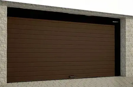 Ворота подъемные гаражные секционные для размера проема по ширине 1100 мм, по высоте 1800 мм, серия RSD02 с торсионными пружинами, стальное полотно ворот, цвет RAL 8014 коричневый, дизайн доска, задвижка